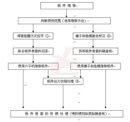 (4)鈑金件拉平。根據(jù)鈑金件損傷程度,采用相應(yīng)的鈑金工具將凹陷部位拉平。拉平作業(yè)后,鈑金件表面要經(jīng)過(guò)平整度精調(diào)。