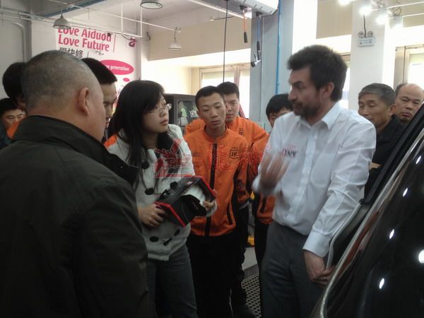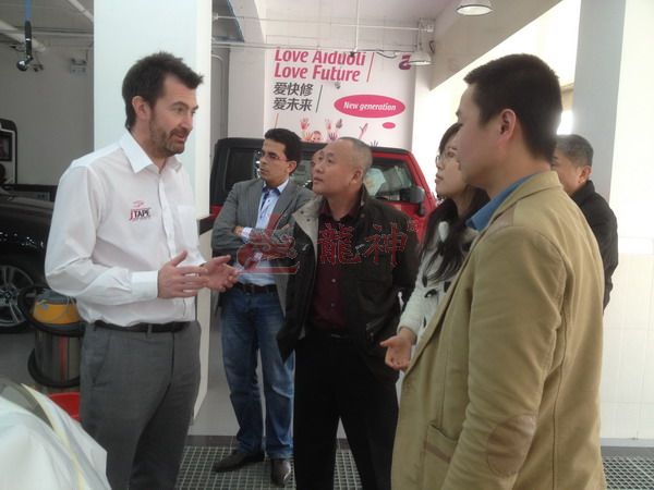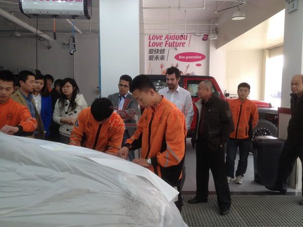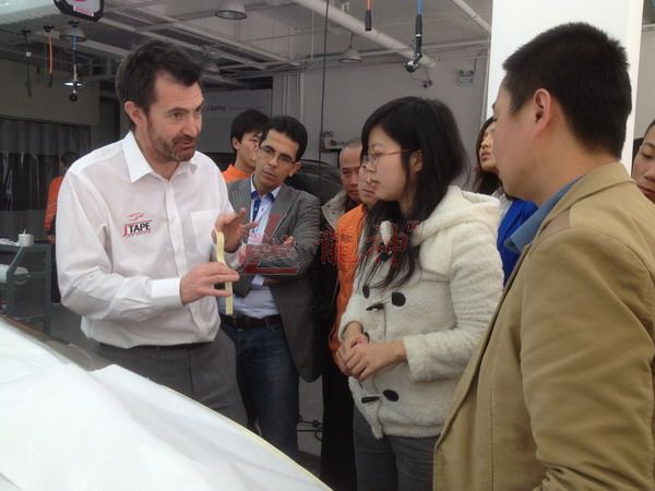 本司訊:2013年4月北京晴空萬里,龍神公司特邀英國專家一行五人,來到了北京車爵士進行汽車噴涂遮蔽技術(shù)交流。首先公司一行了解車爵士的汽車噴涂情況及詢問了使用的遮蔽工具情況。隨后英國專家針對在汽車噴漆時難噴涂的車門縫隙、玻璃死角等地方的專業(yè)遮蔽工具的演示。車縫泡沫膠:用于車身所有縫隙的遮蔽,有效隔離及遮蔽漆霧噴入車縫里。