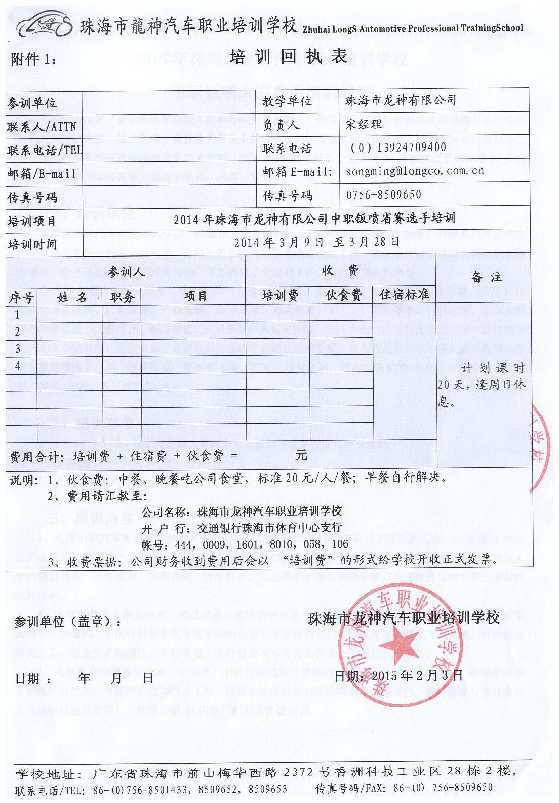 為了響應(yīng)國家“企業(yè)應(yīng)該積極融入和參與職業(yè)教育事業(yè)”的號召,讓部分參賽條件和設(shè)施不足的學(xué)校也能參加技能大賽,促進全國中職技能大賽在全國的快速和均衡地發(fā)展,珠海市龍神有限公司憑借自身二十多年的汽車鈑噴行業(yè)經(jīng)驗和設(shè)備技術(shù)優(yōu)勢,定于2015年3月9至3月28日在珠海舉辦為期20天的汽車車身修復(fù)與涂裝技能大賽選手培訓(xùn),具體方案如下: