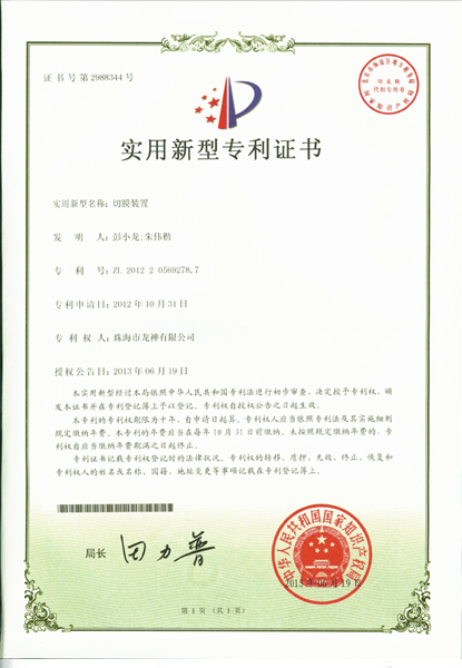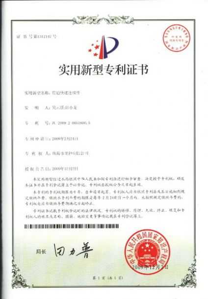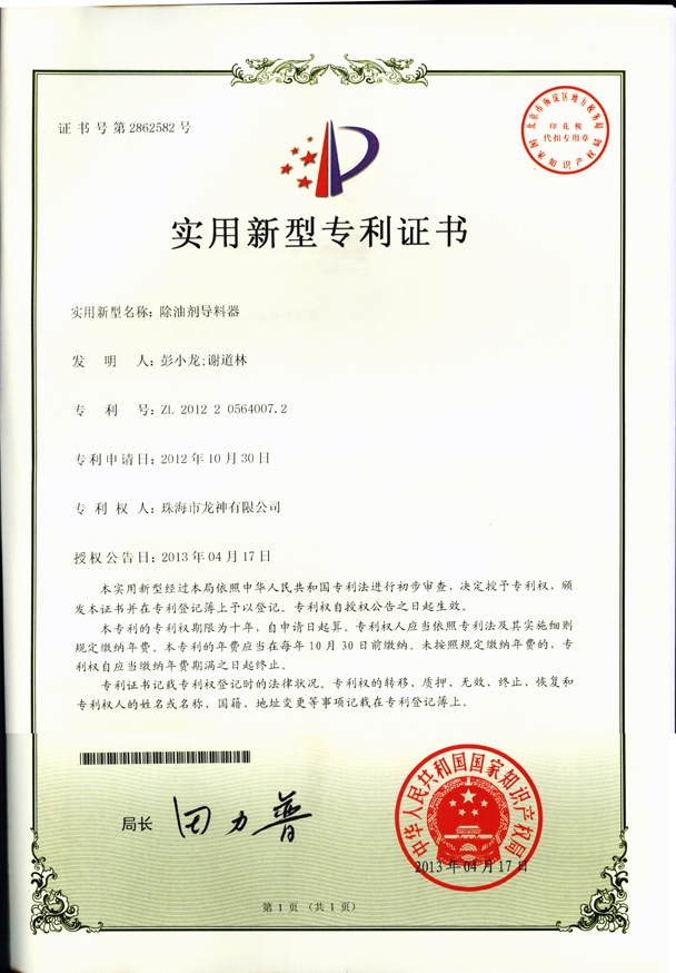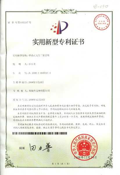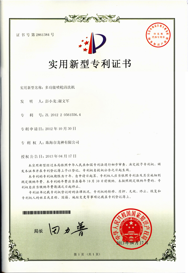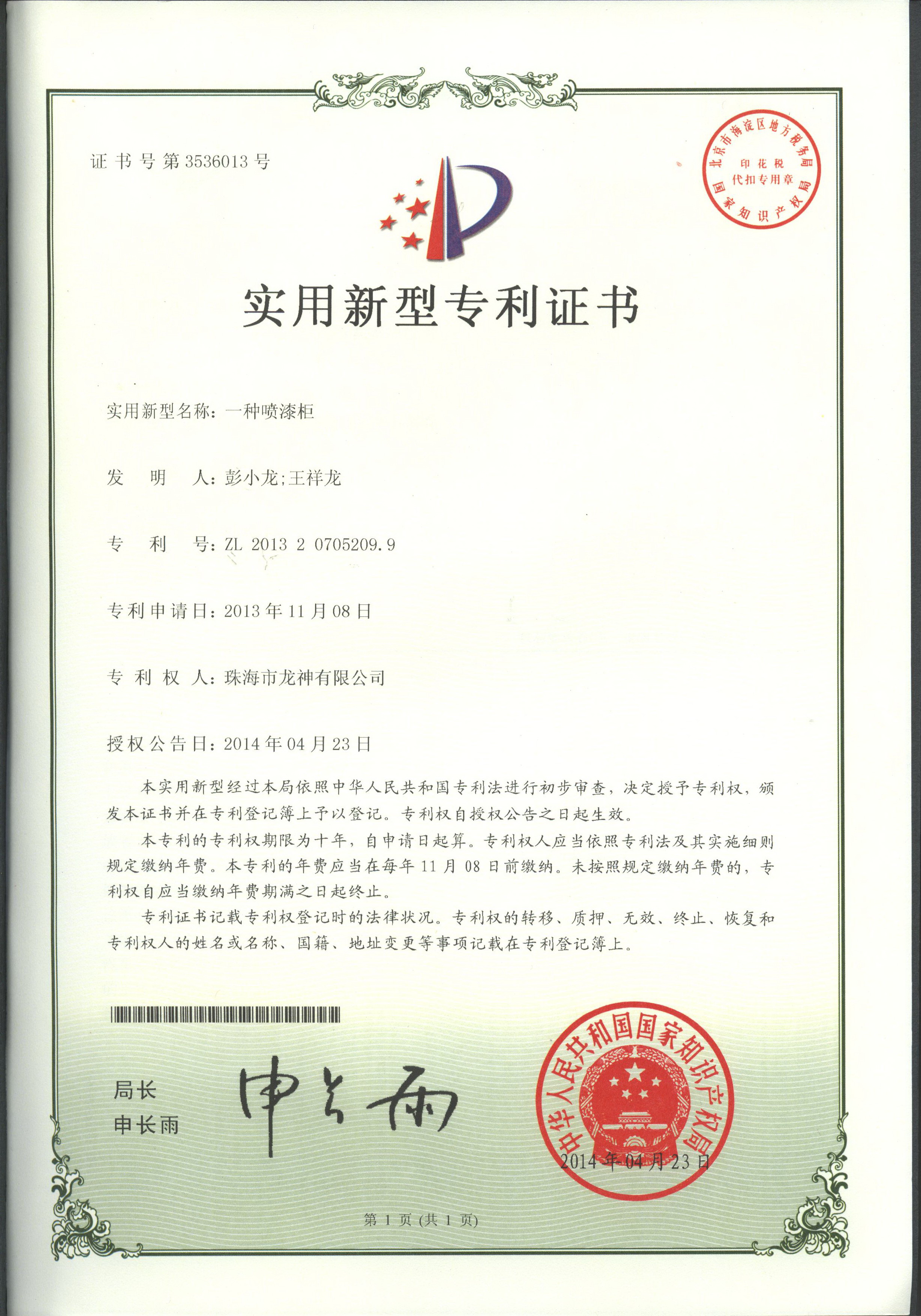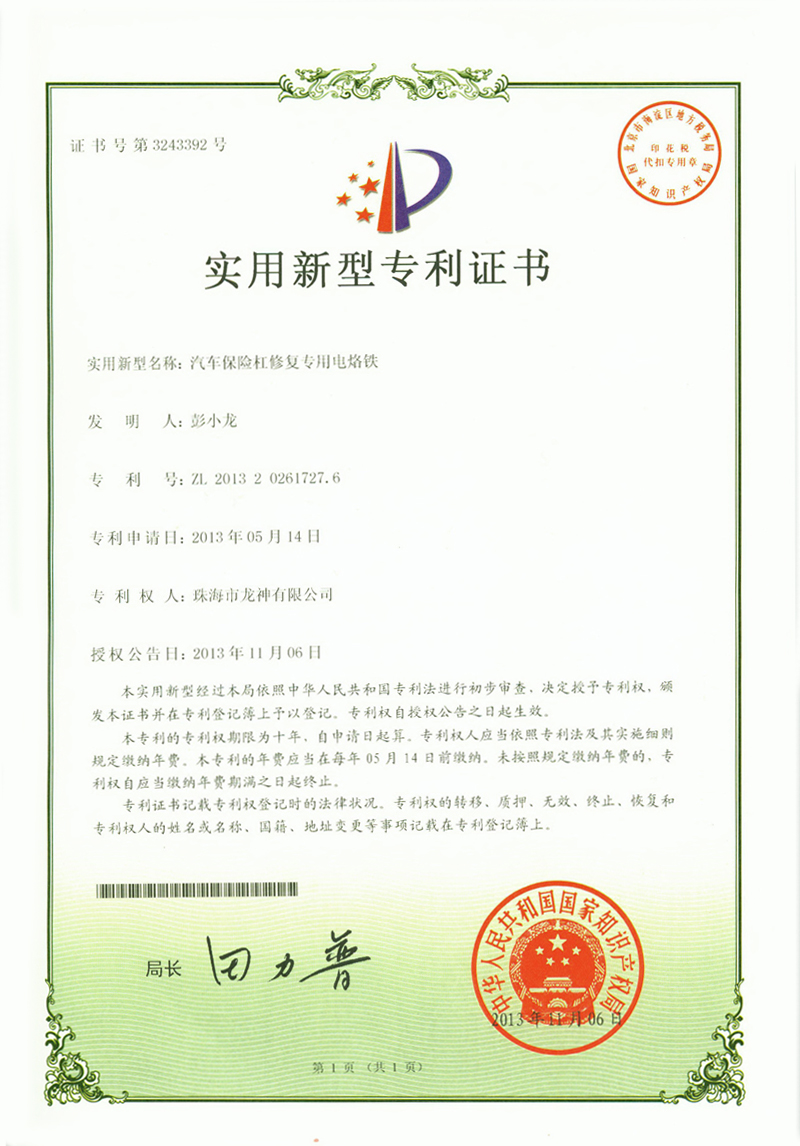 企業(yè)榮譽 調(diào)漆裝置專利證書 噴漆柜專利證書遮蔽紙切紙架專利證書 塊型拉拔鉤專利證書 噴槍清洗機專利證書無靜電干燥加熱器專利證書 壓縮空氣空壓機房供應(yīng)系統(tǒng)專利證書除油劑導(dǎo)料器專利證書多功能噴槍清洗機 環(huán)保自吸塵打磨系統(tǒng) 切膜裝置汽車保險杠修復(fù)專用電烙鐵 精確可調(diào)整形架專利證書 移動式無塵干磨專利證書 管道快速連接件專利證書 彭小龍總經(jīng)理證書 2012-11-27 30876