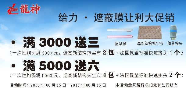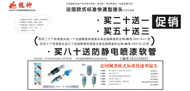 法國佩釜快速接頭促銷方案(產(chǎn)品編號:36102000-36119000)一、主題:“冰夏”促銷行動 二、目的:回饋新老客戶,讓利大反饋 三、時間:1、 啟動時間:2013年5月13日 2、 結(jié)束時間:2013年7月13日3、 時長:2個月 四、活動內(nèi)容:1、 買二十送一(即買二十個快速接頭送一個法國佩釜快速接頭或法法國佩釜吹塵槍(編號:38016)一把) 2、 買五十送三 3、 買八十送防靜電噴漆軟管(編號:36323)五、其它 1、本活動最終解釋權(quán)歸珠海龍神所有。
