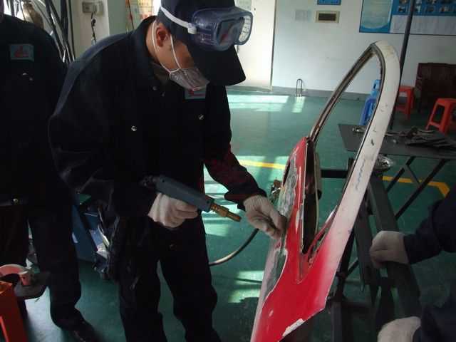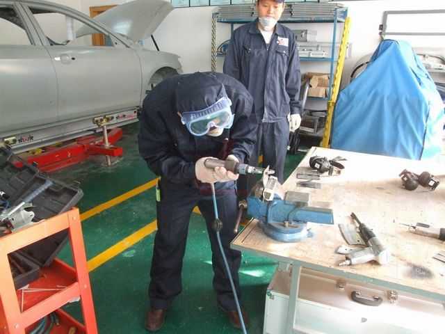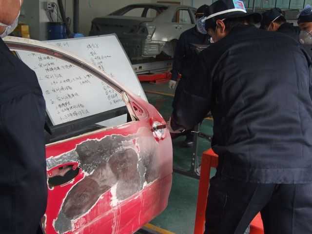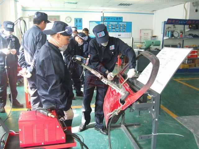 鈑金組朱老師指導(dǎo)正確使用鈑金整形架和工具修復(fù)車身